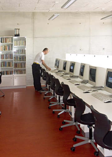Alle PCs und alle Räume in sind miteinander vernetzt, d.h. ein Server im Serverraum (1.11) hält ständig alle nötigen Programme, Internetdienste und Speicherplatz für jeden angemeldeten Benutzer bereit. In jedem Raum der Schule gibt es eine Datensteckdose (markiert mit grünem Punkt), an die mittels eines Netzwerkkabels jeder Schul-PC und der Laptop angeschlossen werden können, um auf den Server zugreifen oder auch im Internet surfen zu können. Als Server dient ein DELL PowerEdge 2850: Intel Xeon Prozessor 2.80 GHz, 1 MB Cache, 800 MHz FSB; Arbeitsspeicher mit 2 GB Single Rank DDR2 Memory; 4 x 73 GB SCSI-Festplatte, 10.000 U/min; PERC 4e/Di onboard RAID Controller; 3.5 inch 1.44 MB Floppy; 8x DVD-ROM Drive; Gigabit- Netzwerkkarten (2 x Intel pro 1000) und das alles abgesichert durch eine USV (unabhängige Stromversorgung). Jeder Schüler hat einen Speicherplatz von 100 MB auf dem Server, jeder Lehrer einen von 300 MB.