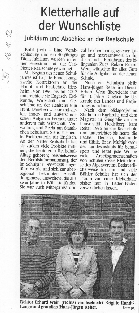Seit Anfang des neuen Schuljahres ist Brigitte Randt-Lange 2. Konrektorin an der HRS Iffezheim. Von 1996 bis Juli 2012 unterrichtete sie Englisch und EWG (Erdkunde/Wirtschaft/Geschichte) an der Realschule in Bühl. Daneben war und ist sie mit vielen inner- und außerschulischen Aufgaben betraut, u. a. als Beauftragte für Wirtschaft/Verwaltung/Recht am Staatlichen Schulamt. Sie ist bis heute Fachberaterin für Englisch. An der CNR hat sie viele Projekte initiiert, die heute zum Realschulleben in Bühl gehören: Der Berufsinformationstag, der im Schuljahr 1999/2000 eingeführt wurde, weitete sich zur überregional bekannten Ausbildungsmesse, die alle zwei Jahre in Bühl stattfindet. Sie war Mitorganisatorin zahlreicher Pädagogischer Tage und „mitverantwortlich“ für die schnelle Einführung des bilingualen Zugs an der CNR. Rektor Erhard Wein sowie alle Lehrer wünschten ihrer ehemaligen Kollegin alles Gute für die Aufgaben an der neuen Schule.