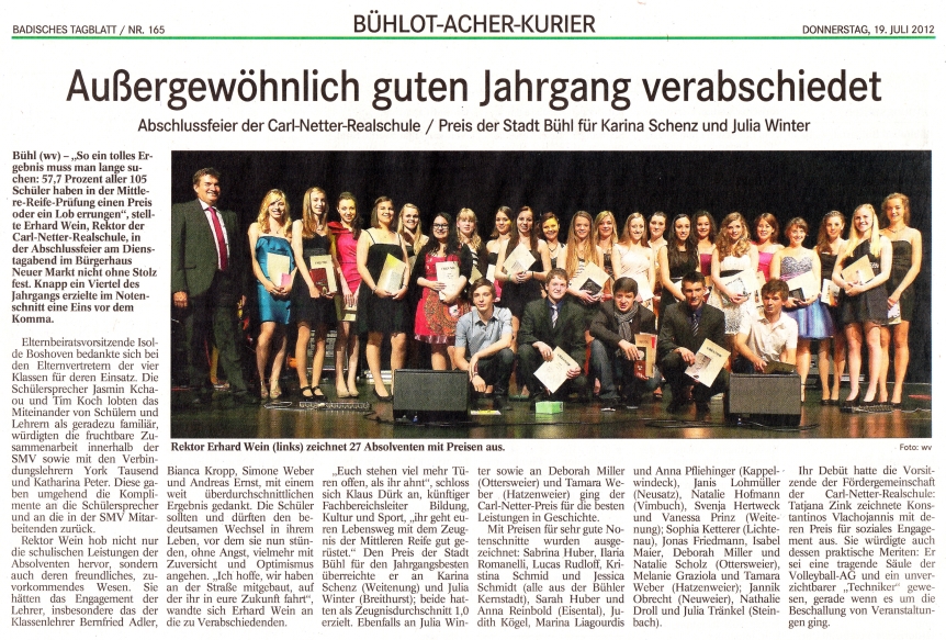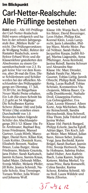 Prüfungsvorsitzender Wolfgang Noller, Rektor der Rastatter Schule, sowie Rektor Erhard Wein und die Klassenlehrer gratulierten den 105 Absolventen zu einem so guten Gesamtdurchschnitt von 2,3.