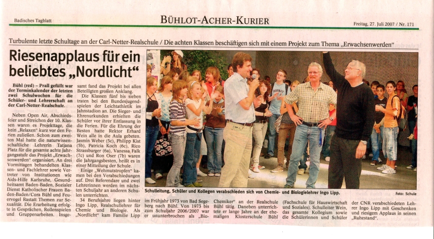 Als „ Nordlicht ” kam Familie Lipp im Frühjahr 1973 von Bad Segeberg nach Bühl. Nach seinem Studium in Kiel hatte er in Lübeck das 2. Staatsexamen für Realschulen gemacht. Von 1973 bis zum Schuljahr 2006/2007 war er ununterbrochen als „ Bio-Chemiker” an der Realschule Bühl tätig. Daneben unterrichtete er lange Jahre an der ehemaligen „ Klosterschule Bühl ” (Fachschule für Hauswirtschaft und Soziales). Rektor E. Wein, das gesamte Kollegium sowie die Schülerinnen und Schüler der CNRS verabschiedeten Lehrer Lipp mit Geschenken und riesigem Applaus in seinen „ Ruhestand ”.